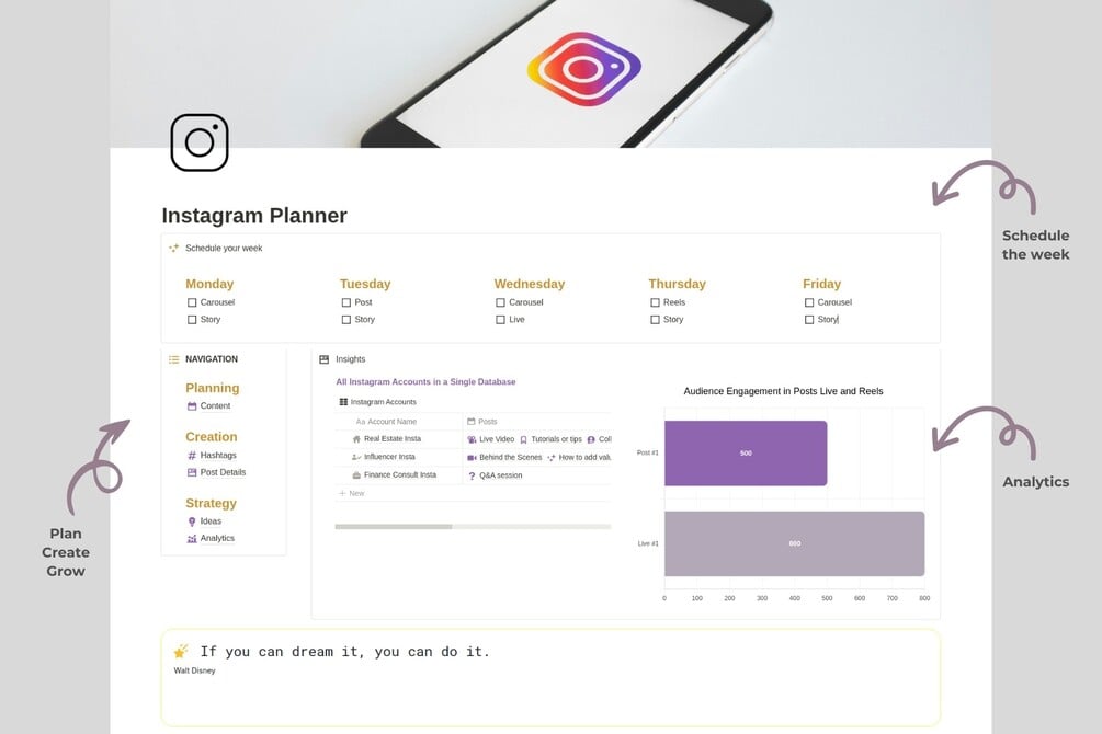 β¨ Designed with the concept idea of an Instagram Dashboard, this template offers a very intuitive system to organize your posts, tasks, and analytics like never before. Say goodbye to scattered notes, forgotten ideas, and wasted time searching for crucial information. With Instagram PlannerTemplate, you'll have a digital companion that will revolutionize the way you work and influence. π